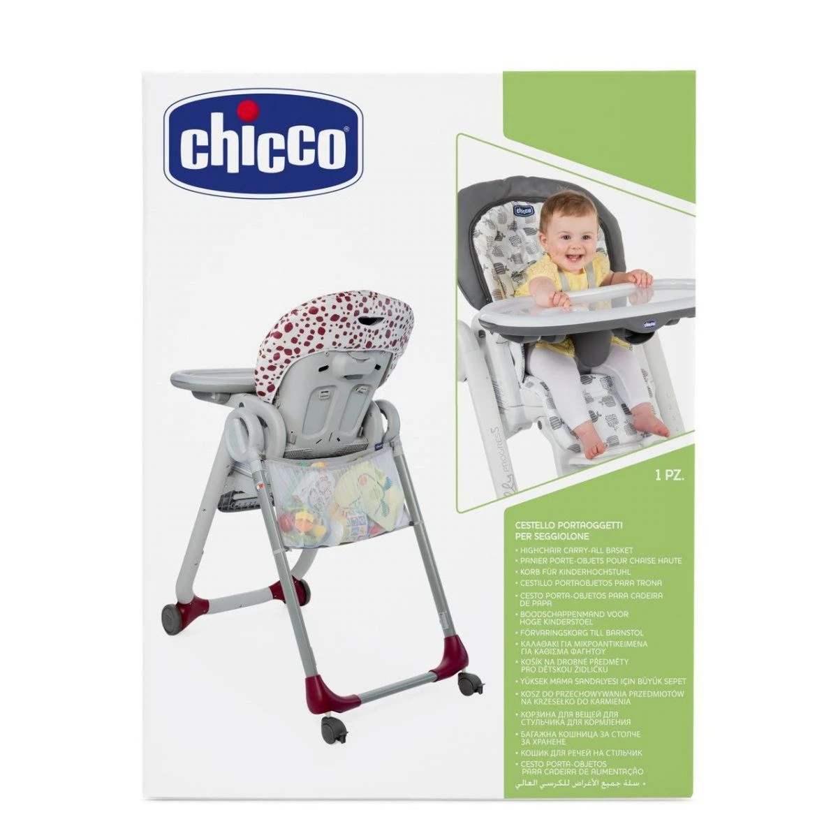 Le panier suspendu est compatible avec les chaises hautes Chicco Polly Progres5, Polly Magic Relax, Polly2Start et Pocket Meal. Le jouet préféré disparaît ici en un rien de temps et peut être ressorti après les repas.