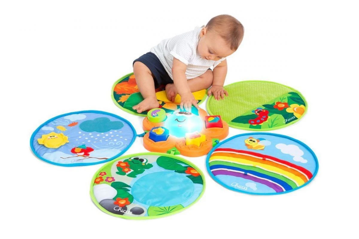 Le tapis de jeu des saisons est enrichi de stimuli musicaux et lumineux calibrés pour aider les enfants à développer leurs capacités de concentration. La partie centrale de la fleur s’illumine de la couleur de la forme insérée. Chaque fois qu’une action est effectuée, la fleur s’illumine d’un effet lumineux apaisant et une musique est diffusée pour favoriser la concentration / des sons de la nature. Le son peut être désactivé pour aider le bébé à concentrer son attention uniquement sur les stimuli lumineux et sur les actions qu’il effectue.
