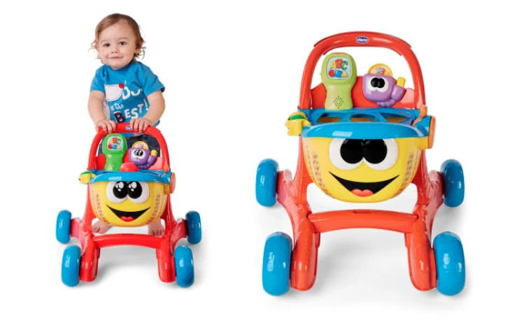 Happy Shopping est un jouet bilingue complet : centre d’activités manuelles et électroniques, scanner parlant pour apprendre ses premiers mots en français et en anglais et aide à marche grâce à ses roues stables et le premier chariot de courses pour imiter maman et papa.